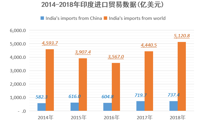 2018年印度貨物貿(mào)易繼續(xù)保持快速增長態(tài)勢,據(jù)印度商業(yè)信息統(tǒng)計署與印度商務(wù)部統(tǒng)計,2018年,印度貨物進出口總額為8367.1億美元,比上年同期(下同)增長11.7%。其中,進口貿(mào)易5120.8億美元,增長13.8%。 2018年中印雙邊貨物進出口額為902.7億美元,增長6.5%。其中,印度自中國進口737.4億美元,增長2.3%,占印度進口總額的14.4%。
