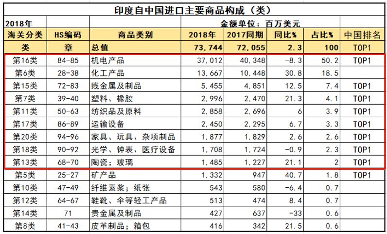 據(jù)印度商業(yè)信息統(tǒng)計署與印度商務(wù)部統(tǒng)計,2018年,印度自中國進口的主要商品為機電產(chǎn)品、化工產(chǎn)品和賤金屬及制品,2018年合計進口561.3億美元,占自中國進口總額的76.1%。 除上述產(chǎn)品外,塑料、橡膠、紡織品及原料、運輸設(shè)備等也為印度自中國進口的主要大類商品。 其它如家具、玩具、雜項制品、光學(xué)、鐘表、醫(yī)療設(shè)備、陶瓷、玻璃等大類上,中國也是印度的第一進口來源國。